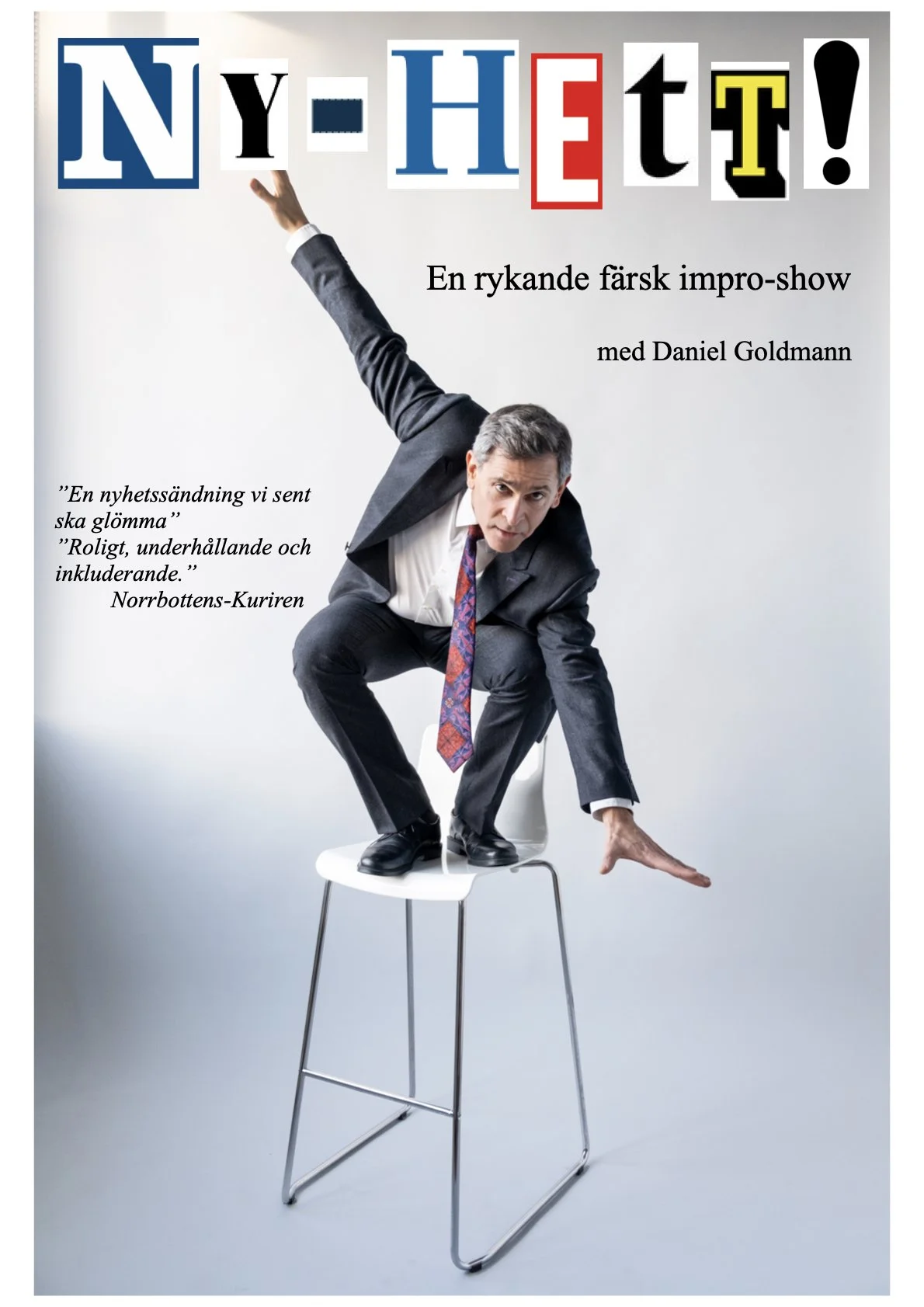 När världen brinner kan det vara skönt, kanske till och med nödvändigt, att se små och stora nyheter från ett helt annat håll än vanligt. Skådespelaren Daniel Goldmann bjuder på en galet humoristisk nyhetssändning, live från scenen. Publiken väljer ur dagens nyhetsflöde och han omvandlar nyheterna till improviserad teater. Minsta notis kan bli en episk opera eller kanske ett rafflande westernäventyr.